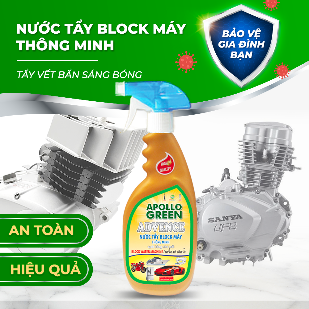 Dùng nước tẩy block máy thông minh APOLLO GREEN phun lên bề mặt vùng bẩn, sau đó dùng bàn chải đánh sạch và lau lại bằng nước cho mới.